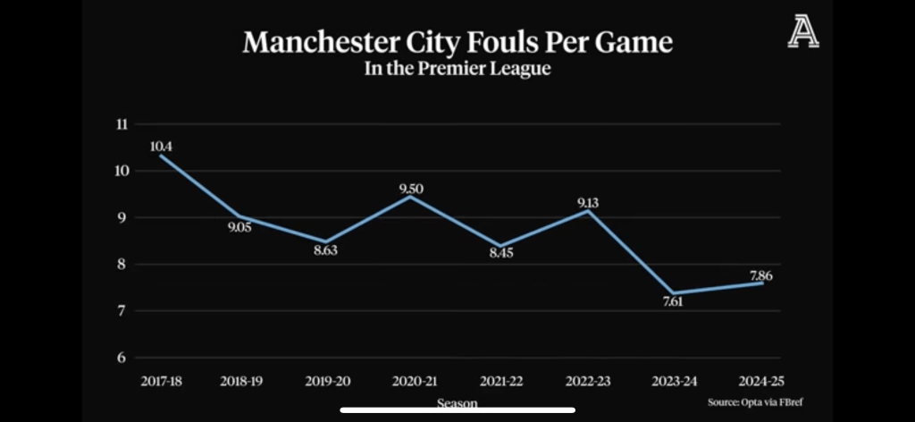 City this season have committed fewer of these fouls over the years, and the last 2 seasons have seen their lowest number of fouls per game.