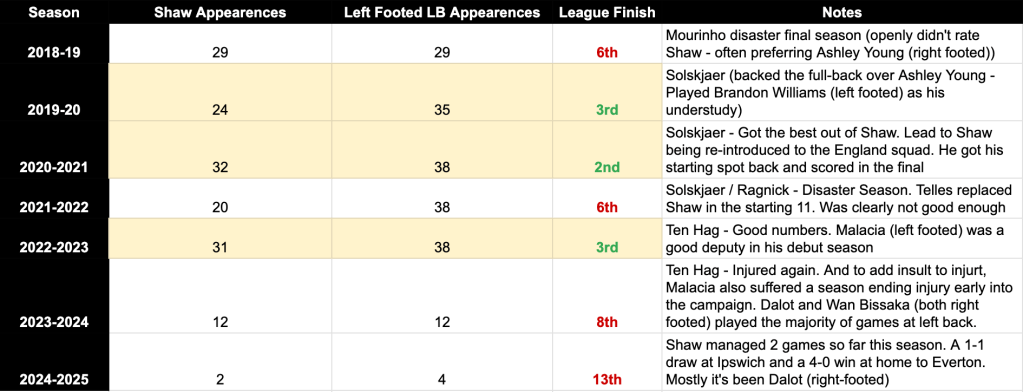 Between 2019 and 2021 under Ole Gunnar Solskjaer, Shaw was promoted to lead the left side of United’s defence. He played in 56 of Solskjaer’s 76 games in charge during that time – a record over two seasons he hasn’t beaten since.